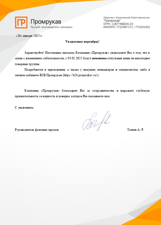 Компания ООО «Промрукав» уведомляет Вас о том, что в связи с изменением себестоимости с 03 февраля 2025г. будут изменены отпускные цены на некоторые товарные группы (во вложении).