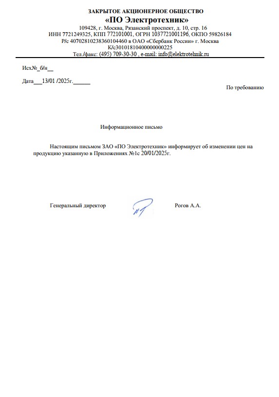 ЗАО «ПО Электротехник» информирует об изменении цен на продукцию указанную в Приложениях №1с 20/01/2025г.