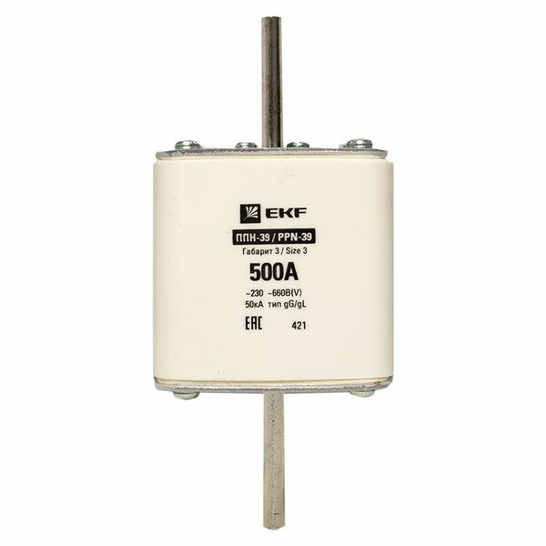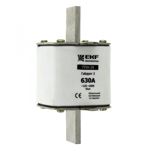 Плавкая вставка ППН-39 630/500А габарит 3 EKF. Предохранители плавкие ППН EKF, укомплектованные плавкими вставками типа gG/gL, предназначаются для защиты кабельных линий и промышленных электроустановок от токов перегрузки и короткого замыкания. Предохранители применяются в электрических сетях переменного тока частотой 50 Гц с напряжением до 660В. Применяются для крепления в распределительных и вводно-распределительных устройствах. Предохранители плавкие ППН могут устанавливаться в основание с держателем, а также в специально предназначенные рубильники. В комплект поставки предохранителей плавких ППН основание с держателем не входит и приобретается отдельно.