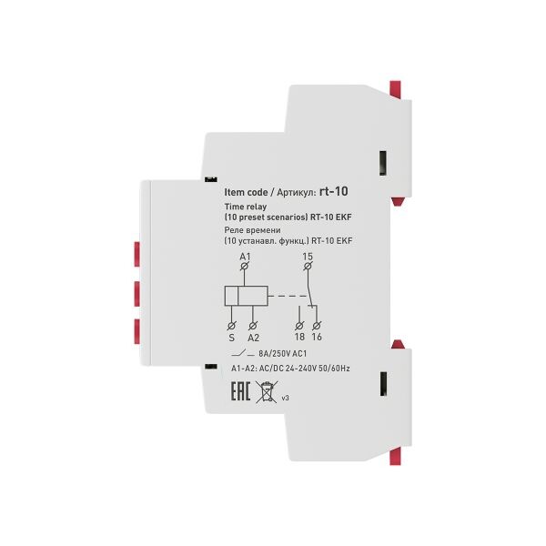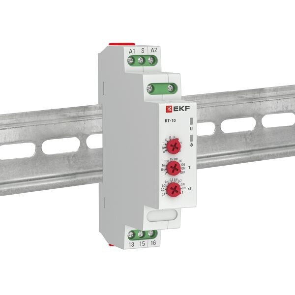Многофункциональное реле времени RT-10 EKF является электронным коммутационным аппаратом с регулируемыми режимами работы и регулируемой установкой времени. Реле предназначено для включения или отключения нагрузки по заданным временным величинам и режимам работы. Переключение диапазонов времени и исполняемой функции производится с помощью поворотных регуляторов расположенных на лицевой поверхности реле. Реле может работать по одной из 10 возможных функций