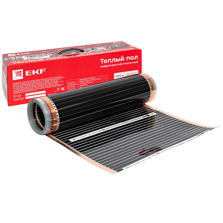 Пленочный теплый пол EKF применяется для сухого монтажа без стяжки не только при капитальном ремонте, но и при косметическом. Толщина пленки -0,338 мм. Обеспечивает быстрый и легкий монтаж. Идеально подходит для укладки под ламинат, паркетную доску, мягкое напольное покрытие: линолеум, ковролин. Инфракрасный пленочный теплый пол состоит из следующих элементов. Полосы углеродного материала шириной около 1,5 см соединены между собой при помощи медных шин с серебряным покрытием, которые и проводят электрический ток. Нагревательный элемент заламинирован с двух сторон плотным полимером, который не задерживает инфракрасное излучение и обеспечивает отличную защиту от попадания влаги, пробоев и возгорания.