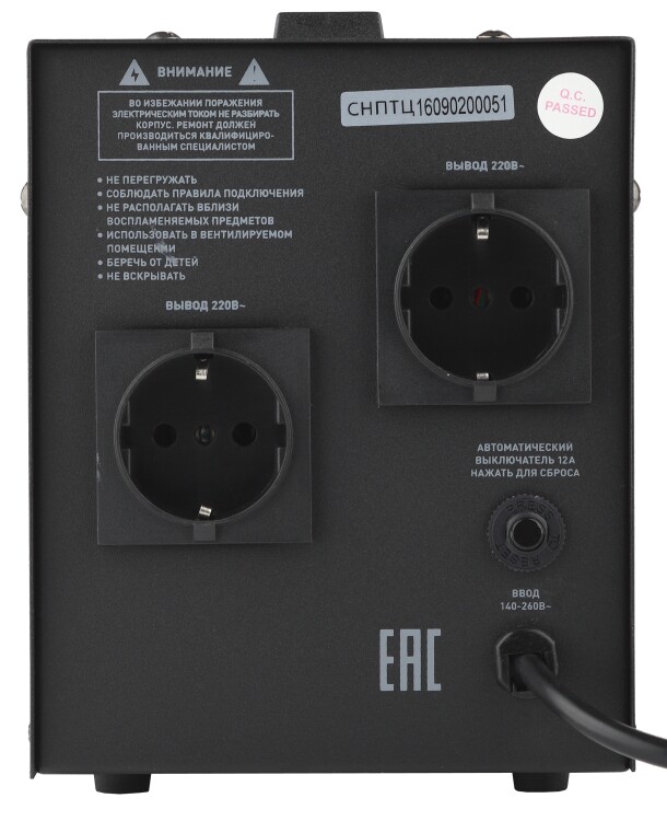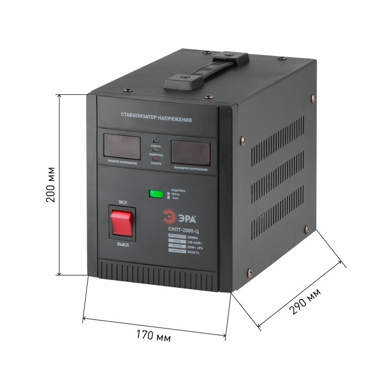 Стабилизатор напряжения переносной /напольный однофазный релейный цвет чёрный модели СНПТ-2000-Ц. Номинальные характеристики (полная мощность / диапазон входного напряжения): 2000ВА 140-260В . Предназначен для поддержания стабильного однофазного напряжения питания бытовых приборов при отклонениях значений сетевого напряжения. Выбирая стабилизатор, нужно знать, какое электрооборудование будет к нему подключено: один прибор, группу приборов либо вся домашняя (офисная) техника. Затем необходимо рассчитать суммарную мощность защищаемых электропотребителей. Основное условие выбора мощности стабилизатора напряжения - суммарная мощность подключаемой к нему нагрузки не должна превышать полной мощности самого стабилизатора (в противном случае автоматика стабилизатора будет их просто отключать). Точные значения мощности можно узнать из паспортных данных Вашего конкретного потребителя. Стабилизатор подбирается с запасом в 25-30% к его полной мощности.