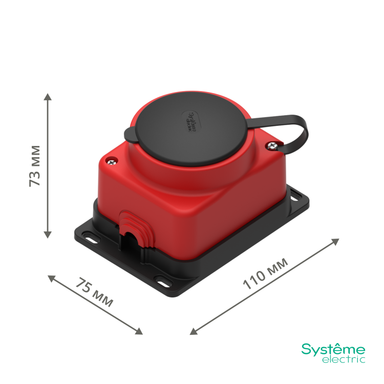 Розетка открытой установки каучуковая MultiSet (Systeme Electric) (2К+З) 16А/250В. Предназначена для установки на поверхность. Обладает повышенной прочностью и степенью пылевлагозащиты IP44. Имеет 4 отверстия для крепления. Температурный диапазон эксплуатации – от -30 до +45 °С.