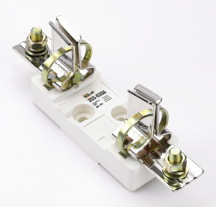 Держатель ножевого предохранителя серии ПН-101 DEKraft; тип 39; габарит 00; номинальный ток до 630 А. Предохранители ножевые применяются в однофазных и трехфазных сетях переменного тока, напряжением до 660 В, частотой 50 Гц. Держатель устойчив к механическим и термическим воздействиям, а также динамическим ударам при коротких замыканиях.