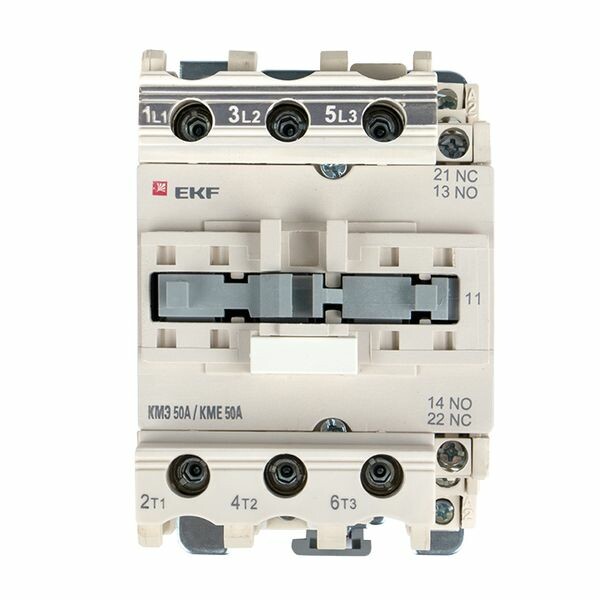 Контакторы КМЭ EKF PROxima состоят из корпуса, закрепленных в нем неподвижных контактов, подвижных контактов, которые закреплены в подвижной части магнитной системы. Неподвижная часть магнитной системы закреплена жестко в корпусе КМЭ. Пружина препятствует смыканию контактов. При подаче напряжения на катушку управления в магнитной системе контактора возникает магнитное поле, которое, преодолевая сопротивление пружины, смыкает магнитную систему и замыкает контакты. При отключении напряжения с катушки управления пружина размыкает контакты. Возможна коммутация алюминиевым и медным проводом.
