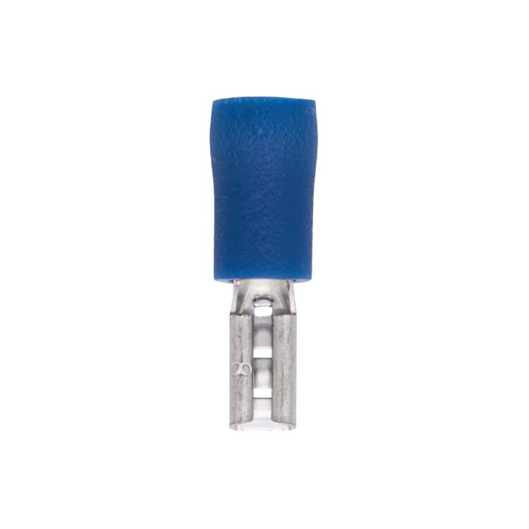 Плоские наконечники быстрого соединения (розетка "мама") предназначены для оконцевания кабеля и проводов с медными жилами сечением от 1.5 до 2.5 мм² в электрических цепях переменного и постоянного тока, напряжение до 600 В. Материал контактной части – электротехническая медь, материал изоляции - ПВХ. Луженое покрытие обеспечивает защиту от коррозии. Фланец изолирован. Номинальный размер соединителя 5,2×0,8 мм. Цвет - синий.