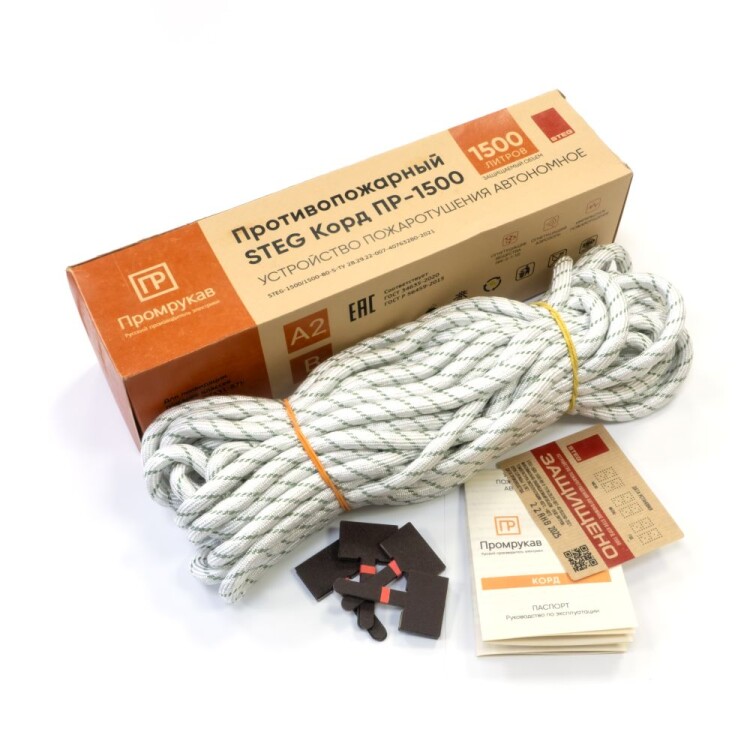 Устройство пожаротушения inSTEG Корд in Промрукав состоит из прочной термостойкой оплетки, наполненной термоактивируемым гранулированным огнетушащим составом комбинированного принципа действия. Гранулы включают в себя микрокапсулы с газовым огнетушащим веществом (ФК-5-1-12) и аэрозолеобразующий огнетушащий состав. Гибкость шнура позволяет распределить его в местах наиболее близких к очагу возможного возгорания (электротехнические шкафы, контактные группы, скопление проводов, электрооборудование и пр.), предотвращая возникновение и развитие пожара на ранней стадии в объемах до 1 500 литров. При воздействии пламени на Корд или достижении в точке нагрева температуры срабатывания (+160...270 °C), гранулы по всей протяженности корда термически разлагаются и импульсно выделяют комбинированные газо-аэрозольные огнетушащие вещества, которые сбивают пламя, резко снижают температуру, на химическом уровне разрушают цепи горения, создавая среду, не поддерживающую горение, и за несколько секунд полностью прекращающую пожар во всем крупногабаритном объеме.