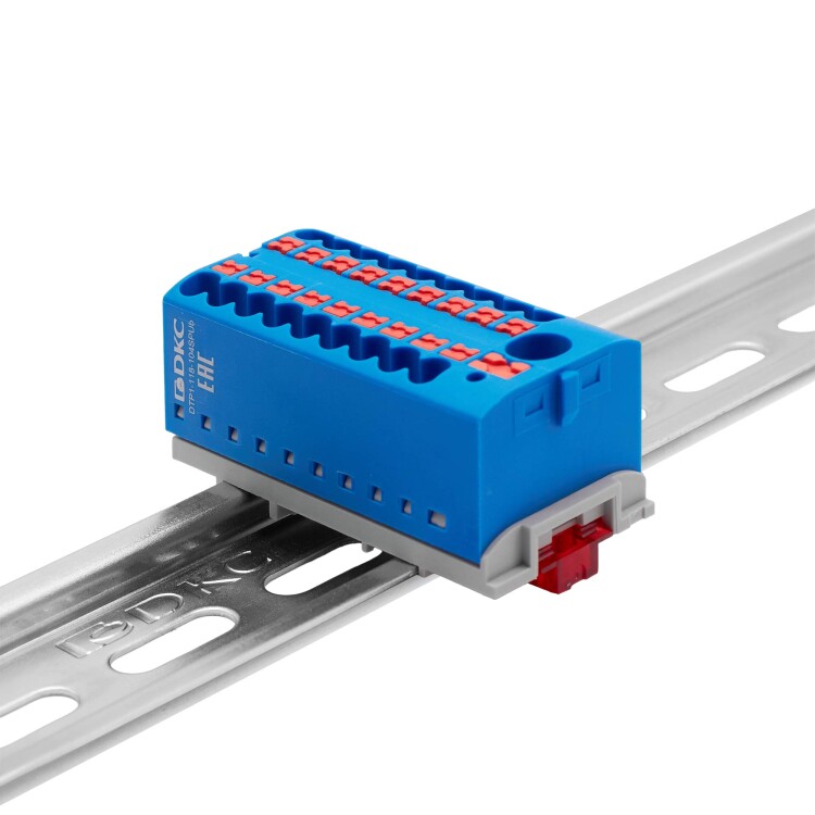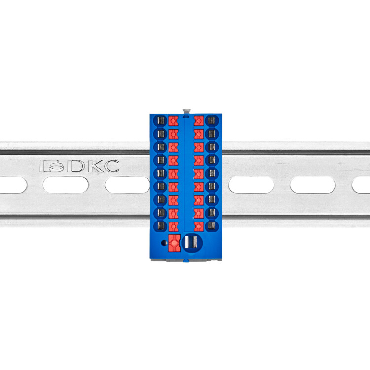 Распределительный блок с push-in зажимом и вертикальным адаптером предназначен для удобного и безопасного распределения потенциала между несколькими цепями. Имеет один ввод для проводников сечением 6 мм² и восемнадцать точек подключения по 2,5 мм². Монтаж выполняется без инструмента, установка возможна на DIN-рейку шириной 15 или 35 мм. Корпус изготовлен из полиамида 6.6 с классом горючести V0 по UL-94, обеспечивающего надежность и термостойкость. Габариты (В×Ш×Г) — 21,7×56,9×28,8 мм, цвет — синий.