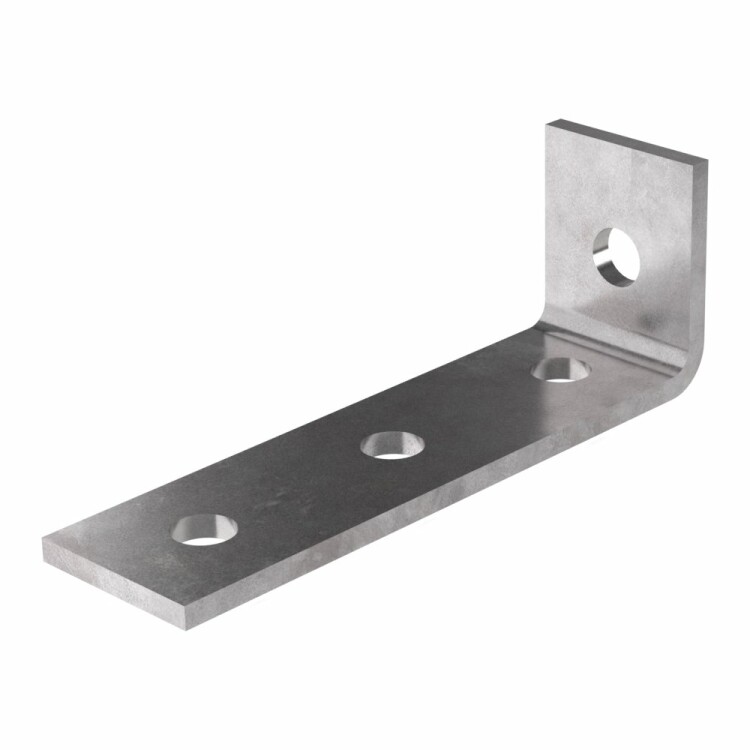 STRUT монтажные элементы в исполнении HDZ - это изделия с защитным покрытием горячий цинк (по ГОСТ 9.307), которые предназначены для создания инженерных систем как внутри помещений, так и на открытом воздухе. Пластина угловая 90 градусов 4 отверстия - Г-образного вида металлическая пластина толщина материала 5 мм. одно круглое отверстие на коротком плече, три отверстия на длинном плече d=12 мм. Применяется для соединения отрезков страт-профиля между собой под углом 90 градусов, для этого используется страт-гайка и болт соответствующего диаметра.