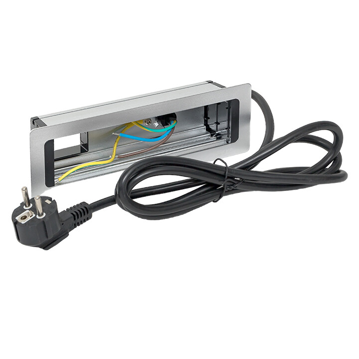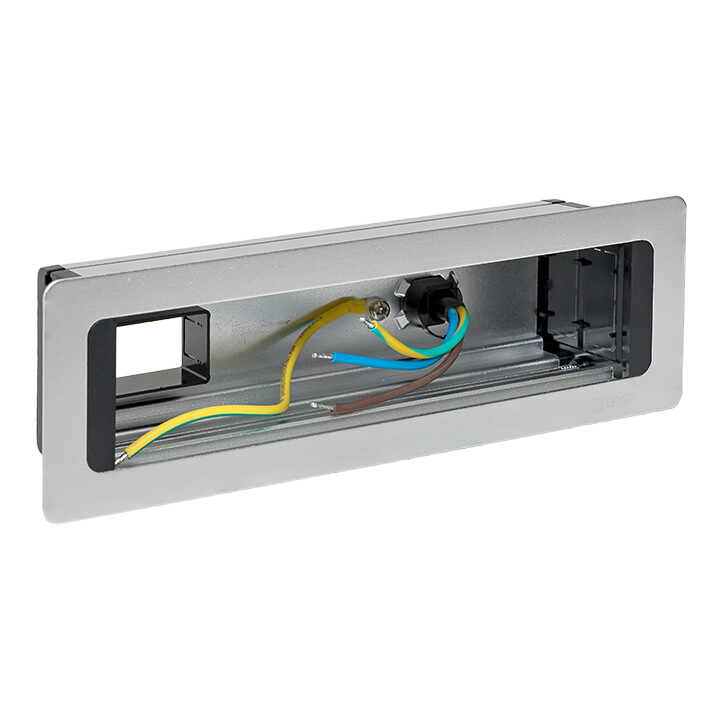 Встраиваемый настольный розеточный блок, 8 модулей, C-Line. Настольный розеточный блок – изделие прямоугольной формы, предназначенное для размещения ЭУИ на уровне поверхности стола. Сетевой кабель питания (2 метра) и крепеж в комплекте. На задней стенке розеточного блока предусмотрено дополнительное отверстие для подведения слаботочных кабельных линий.