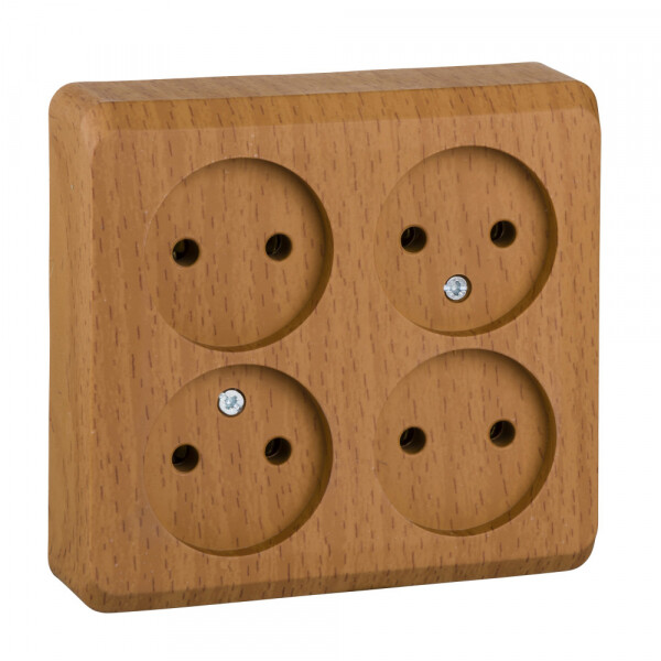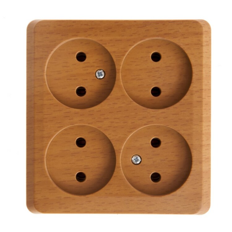 Розетка Systeme Electric (ранее Schneider Electric) ЭТЮД (бук, открытой установки) четырёхместная, без шторок и заземления предназначена для применения в сетях до 250В, на ток до 16А. Четырёхместная розетка позволяет подключить четыре устройства в одном месте. Она проста в установке и удобна в применении. Изделия цвета Бук обладают уникальным рисунком, напоминающим древесный сруб. Сделано в России.