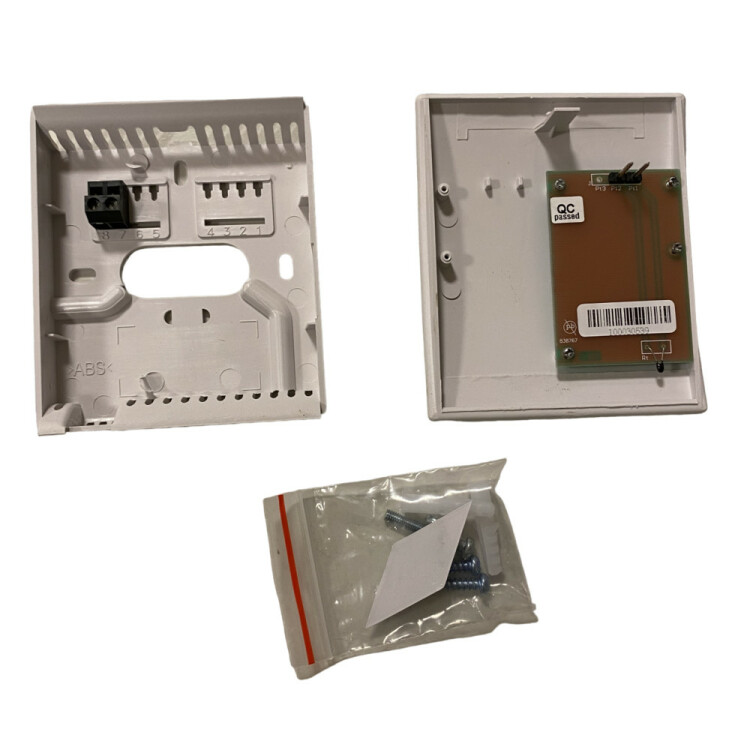 Датчик температуры комнатный, для контроля температуры воздуха в помещении, выходной сигнал NTC10K, подключение на винтовую клеммную колодку, сечение провода до 1,5 мм², накладная настенная установка или установка на подрозетник с расстоянием 60 мм между крепежными отверстиями, степень защиты корпуса IP30, размеры 85×100×25 мм