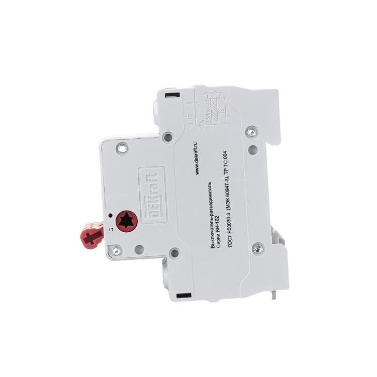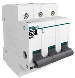 Выключатель-разъединитель серии ВН-102 Dekraft; 3P; номинальный ток 63 А; установка – на DIN-рейку; установочное положение - любое. Выключатели-разъединители применяются для ручного включения/отключения сетей напряжением до 400 В. Специальные мостиковые контакты обеспечивают надежный разрыв цепи; они полностью исключают возможность перекрытия дугой по изоляции. Усиленная рукоятка управления обеспечивает большое количество включений/отключений.