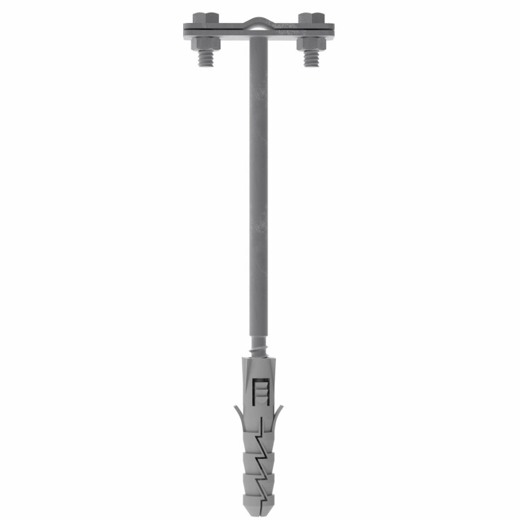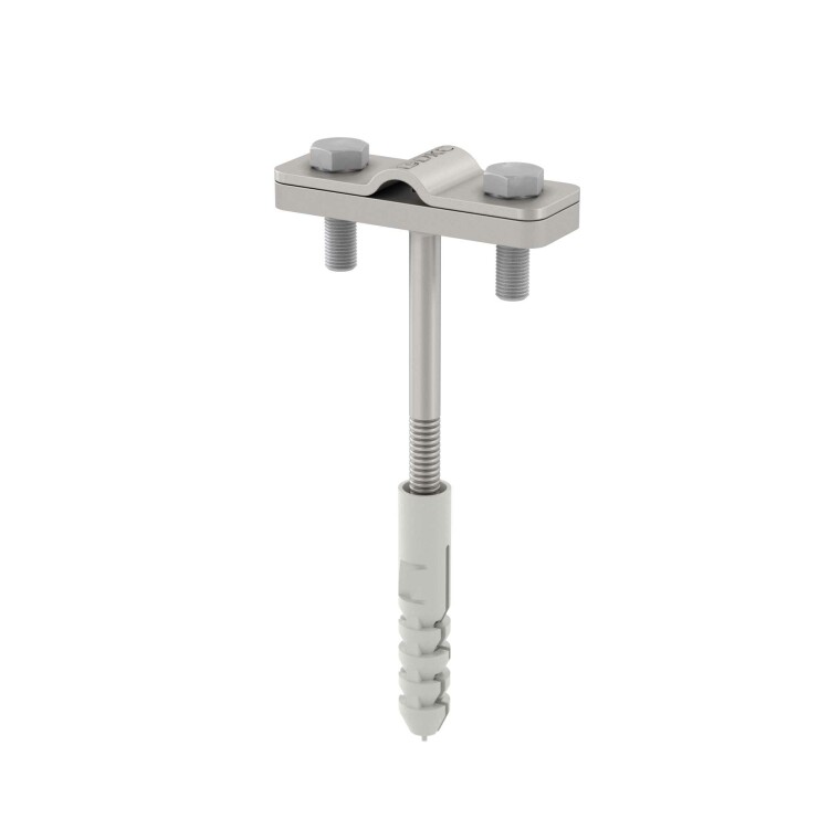 Фасадный держатель применяется для крепления круглых (8-10 мм) и плоских (25 мм) токоотводов по фасаду здания. Способ крепления проводника - болтовой зажим. Длина - 105 мм, материал - горячеоцинкованная сталь.