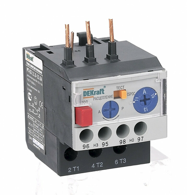 Тепловое реле перегрузки серии РТ-03 DEKraft; предназначено для применения с контакторами КМ-103 на ток 9-18 А; трехполюсное; диапазон уставок реле 11-15 А; класс расцепления 10А; два режима повторного включения - ручной и автоматический. Тепловые реле РТ-03 применяются для защиты цепей переменного тока и электродвигателей от перегрузки, асимметрии фаз, затянутого пуска и заклинивания ротора. Реле подходит к соответствующим контакторам других производителей.