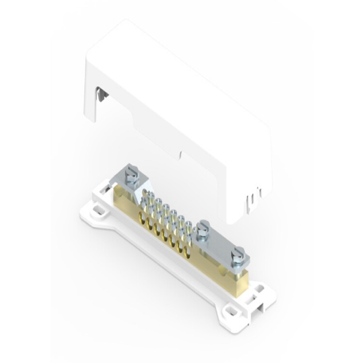 Шина уравнивания потенциалов выполнена из латуни и имеет пластиковый корпус. Имеется возможность подключить 1 плоский проводник сечением до 30х4 мм, 1 круглый проводник диаметром до 8 мм, или до 10 круглых проводников сечением 4–25 мм².