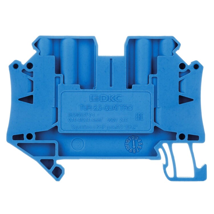 Синий цвет, 4 точки подключения, 2.5 мм². 2 канала для вставных перемычек. Габариты (В×Ш×Г) 47,5×65,4×5,2 мм.