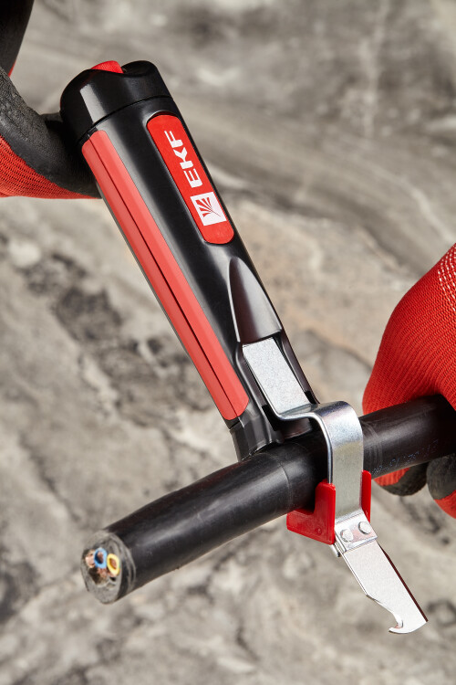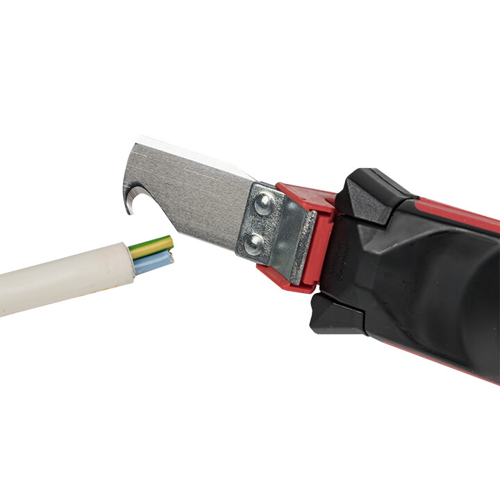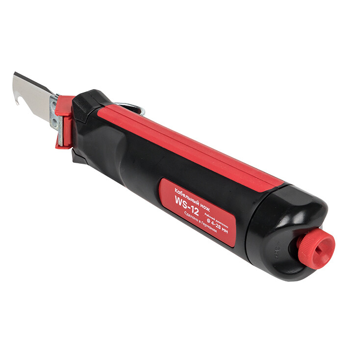 Кабельный нож WS-12 предназначен для быстрого и аккуратного снятия ПВХ-оболочки круглых кабелей диаметром от 4 до 28 мм с помощью встроенного вращающегося лезвия-эксцентрика, позволяющего выполнять как круговой поперечный, так и продольный рез оболочки кабеля