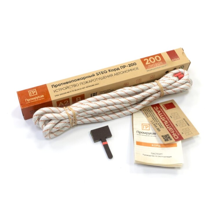 Устройство пожаротушения inSTEG Корд in Промрукав состоит из прочной термостойкой оплетки, наполненной термоактивируемым гранулированным огнетушащим составом комбинированного принципа действия. Гранулы включают в себя микрокапсулы с газовым огнетушащим веществом (ФК-5-1-12) и аэрозолеобразующий огнетушащий состав. Гибкость шнура позволяет распределить его в местах наиболее близких к очагу возможного возгорания (электротехнические шкафы, контактные группы, скопление проводов, электрооборудование и пр.), предотвращая возникновение и развитие пожара на ранней стадии в объемах до 1 500 литров. При воздействии пламени на Корд или достижении в точке нагрева температуры срабатывания (+160...270 °C), гранулы по всей протяженности корда термически разлагаются и импульсно выделяют комбинированные газо-аэрозольные огнетушащие вещества, которые сбивают пламя, резко снижают температуру, на химическом уровне разрушают цепи горения, создавая среду, не поддерживающую горение, и за несколько секунд полностью прекращающую пожар во всем крупногабаритном объеме.