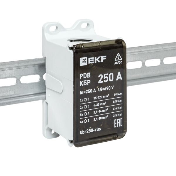 Клеммный блок распределительный КБР EKF — практичное решение для безопасного и удобного распределения питания в электрощитах и шкафах. Выполняет роль переходного клеммника: позволяет подключить жилу большего сечения к нескольким проводникам меньшего сечения и использовать устройство как главную заземляющую шину (ГЗШ). Усиленная защелка на DIN-рейку обеспечивает надежную фиксацию при монтаже и эксплуатации. Предусмотрена возможность пломбировки для защиты от несанкционированного доступа. Все типоразмеры КБР совместимы и соединяются между собой, что упрощает масштабирование и компоновку щита. Крышка открывается в обе стороны для быстрого обслуживания и подключения. Продукция локализована.
