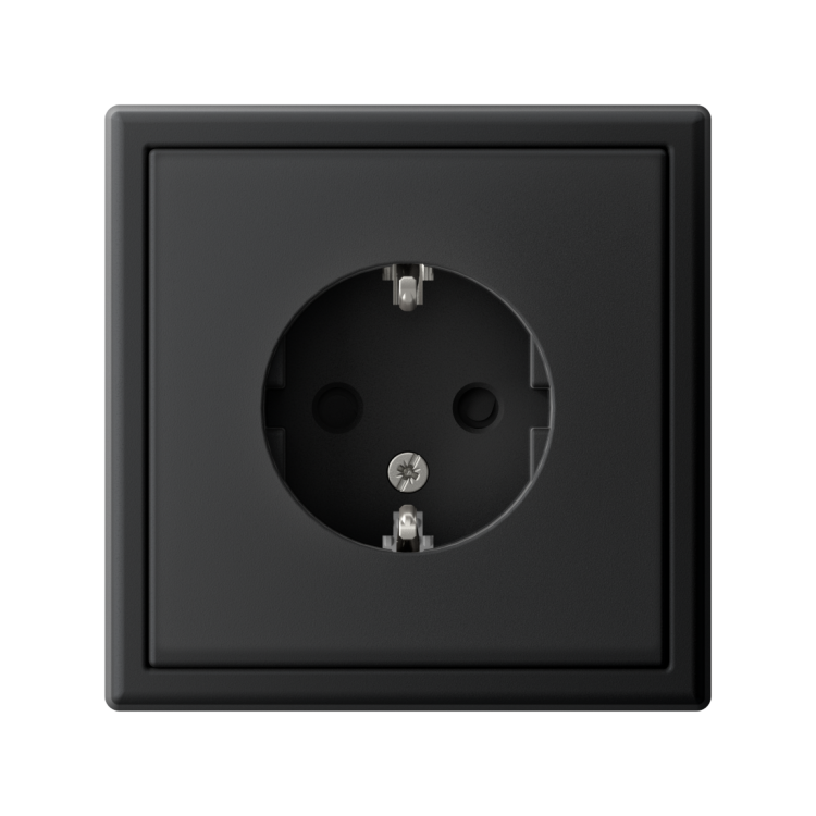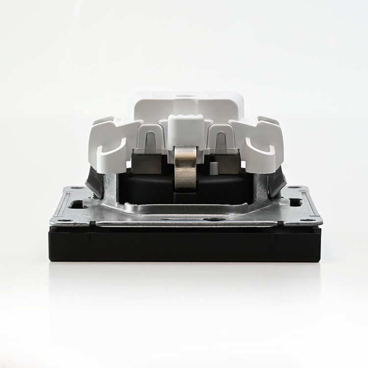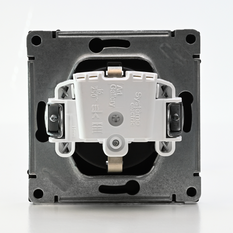 Механизм Systeme Electric серии ArtGallery в цвете карбон розетки одинарной с заземлением и шторками подходит для сетей 250 В, на ток 16 А.
