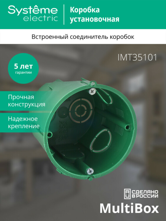 Монтажные коробки Systeme Electric (ра нее Schneider Electric) используются для установки в сплошные стены, например, из кирпича, бетона, пенобетона. Имеют 8 перфорированных отверстий для ввода кабеля или гофротрубы. Коробки соединяются в группы без дополнительных соединителей с расстоянием между центрами 71 мм. ЭУИ крепятся на винтах, входящих в комплект коробки. Внутренние размеры - D65x60 мм, под коронку D68 мм. Степень защиты – IP30, огнестойкость – 650 °С. Материал: полипропилен.
