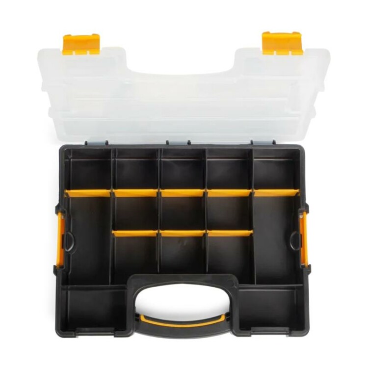 ulliПластиковый кейс-органайзер с модульными отделениями для хранения мелких деталей/liliВ комплекте:ulliпластиковый кейс/lili8 разделительных пластин/li/ul/liliРазмеры основных отделений:ulli182х68 мм 3 шт./lili198х68 мм 2 шт./lili93х58 мм 2 шт./li/ul/liliПри помощи разделительных пластин из 5 больших отделений можно сделать 13/liliКрышка кейса открывается на 90/liliПрозрачная крышка кейса позволяет с легкостью идентифицировать содержимое/liliНадежные замки для фиксации крышки кейса/liliДополнительные боковые замки фиксируют крышку кейса или позволяют устанавливать и закреплять кейсы друг на друге/liliПрочная рукоятка со вставкой из мягкой нескользящей резины для переноски кейса/liliНожки для установки кейса в вертикальном положении/liliГабариты кейса: 370х290х70 мм/liliВес: 0.75 кг/li/ul