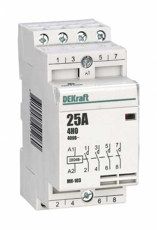 Модульный контактор серии МК-103 Dekraft; н ом.ток 16 А (АС-7а); кол-во и исполнение контактов – 4НО; напряжение управления 220 В пер.тока; ширина – 2 мод. х 18 мм; установка – на DIN-рейку. Контакторы МК-103 применяются в сетях напряжением до 400 В пер.тока для дистанционного управления небольшими нагрузками, требующими большого количества включений / отключений, например, насосы, системы вентиляции и т.п. Модульные контакторы не требуют дополнительных настроек и специального обслуживания.