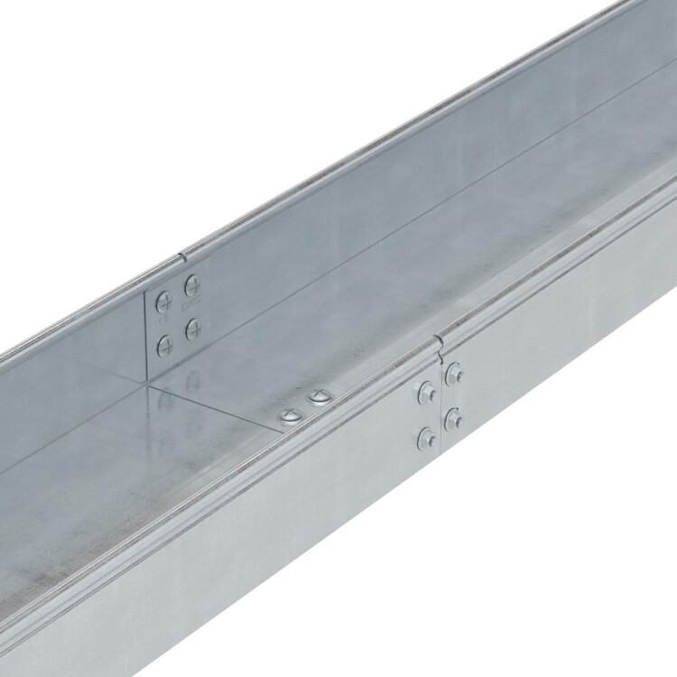 В случае, если лоток был отрезан неровно и при соединении возникает стык, он может быть закрыт соединительной пластиной CGB, которая крепится винтами. Накладка также применяется для дополнительного укрепления мест стыков. Накладка применяется с лотками шириной 200 мм. Аксессуары в исполнении "Цинк-ламель" имеют специальное покрытие на основе химически активной магниевой смолы, в которую добавлены хлопья алюминия и цинка. Такое покрытие обеспечивает электрохимическую и барьерную защиту от коррозии. Показатели коррозионной стойкости цинк-ламельного покрытия ДКС аналогичны показателям горячеоцинкованного покрытия.