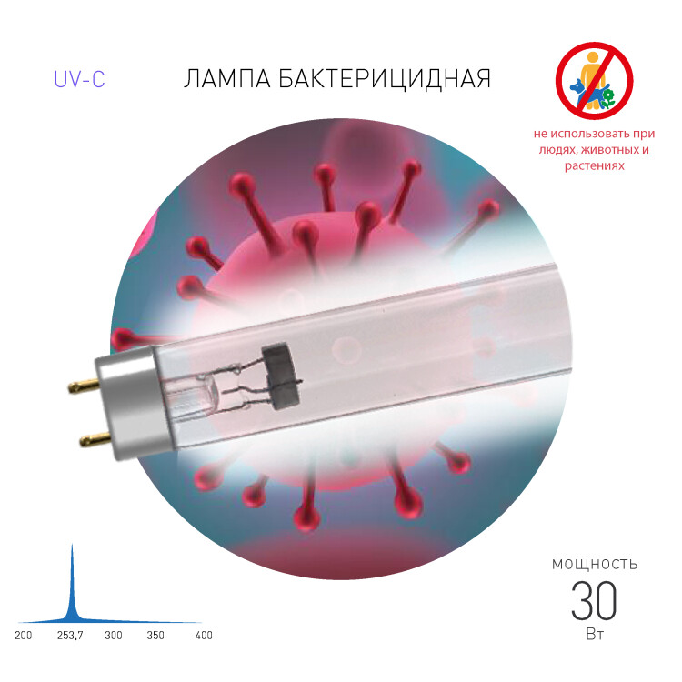 Люминесцентная ультрафиолетовая лампа для обеззараживания помещений, рабочая длинна волны 253.7nm 30 Вт., цоколь G13,тип колбы Т8, 12000 часов. Бактерицидная лампа ДБ 30 T8 G13Тип цоколя - G13; Тип колбы - Т8Мощность, Вт - 30; Поток излучения, Вт - 10.0; Напряжение на лампе, В - 96, Ток на лампе 0,37 А Размеры, мм - L = 908.8; D = 26 Вес лампы, гр - 160. Бактерицидные ультрафиолетовые лампы для пищевой промышленности в ассортименте ЭРА - это удлинённые лампы формата Т8. Лампы УФ-бактерицидные ЭРА представлены в двух вариантах мощности - 15 и 30 Вт.