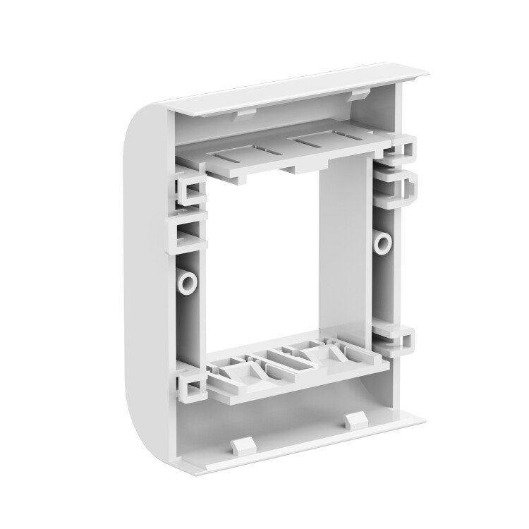 короба, тип TA-GN серии "In-liner Classic". Монтаж: монтаж суппорта внутри короба с помощью защелкивания, монтаж электроустановочных изделий в рамку − защелкиванием изнутри. Характеристики: материал – АБС-пластик и поликарбонат. Комплектация: рамка; суппорт. Типоразмер короба: 80х40, 80х60. Кол-во модулей: 2. Цвет: белый