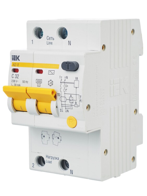 В изделиях предусмотрена индикация срабатывания от дифференциального тока, а для АД12М также светодиодная индикация включенного состояния. АД12М сохраняет работоспособность при снижении напряжения электрической сети до 110 В.
