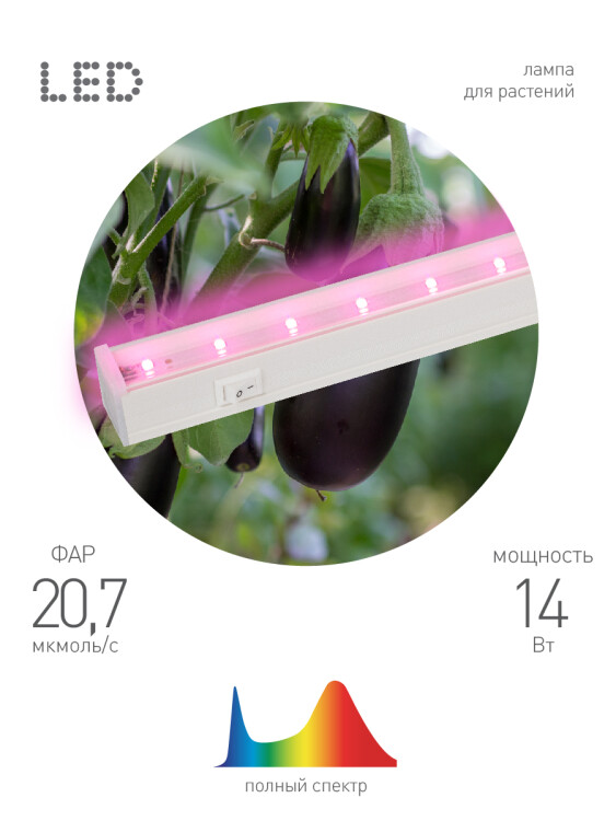 Светодиодный светильник линейный для растений 14 Вт ЭРА LLED-05-T5-FITO-14W-W предназначен для активации роста цветов и рассады. Вы можете поставить фитолампу как у себя в квартире, так и в парнике - она отлично впишется в интерьер любого помещения. Коэффициент пульсаций составляет 0,5%, а потому свет не будет раздражать и не доставит неудобств домашним. К несомненным преимуществам нашего линейного светильника относятся также простая установка и возможность комбинирования спектра. Растения под включенным освещением лучше всего оставлять на 4-6 часов. Установка лампы для роста растений рекомендуется не дальше 60 см, а для максимальной эффективности расстояние уменьшается до 10-20 см. В комплекте к светодиодной лампе прилагаются сетевой шнур, крепежи и коннекторы для подключения. Фитолампа полного спектра ЭРА - залог активного цветения Ваших любимых зеленых растений.