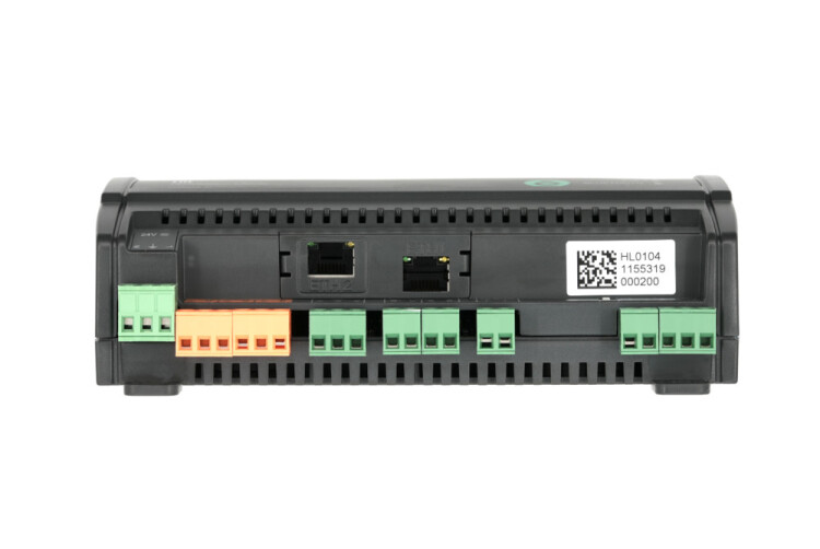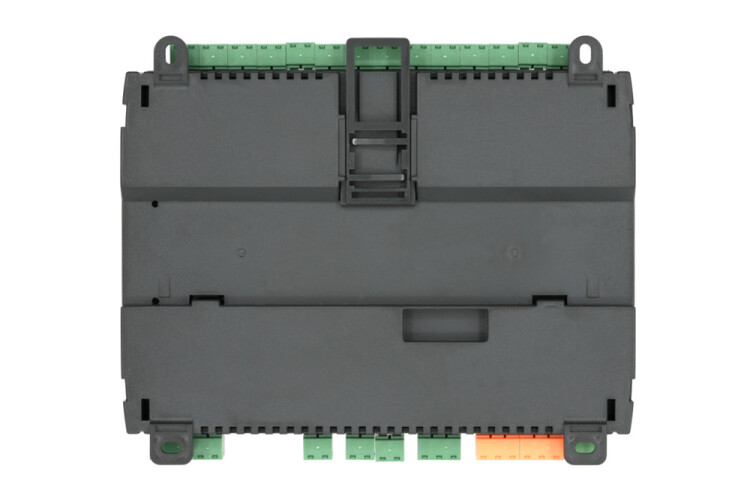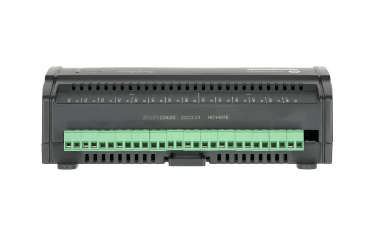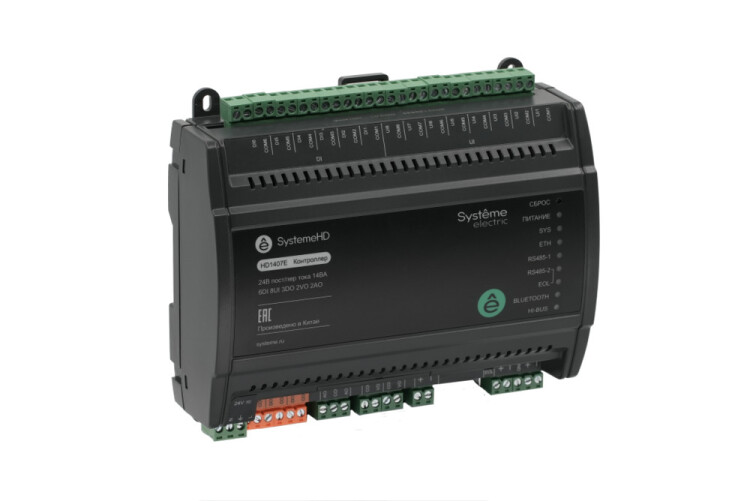 Контроллер серии SystemeHD, 6 дискретных входов, 8 универсальных индивидуально конфигурируемых входов, 3 дискретных релейных выхода, 2 аналоговых выхода AO с сигналом 0…10 В или 4…20 мА, 2 транзисторных выхода VO, конфигурируемых как аналоговый выход 0…10 В или дискретный DOt, два порта Ethernet со встроенным коммутатором, два порта RS485, протоколы BACnet IP, BACnet MS/TP, Modbus TCP, Modbus RTU, поддержка функций BACnet BBMD, COV, Schedule, Time Synchronization, напряжение питания 24 В переменного или постоянного тока, бесплатная среда разработки с программированием FBD и LUA