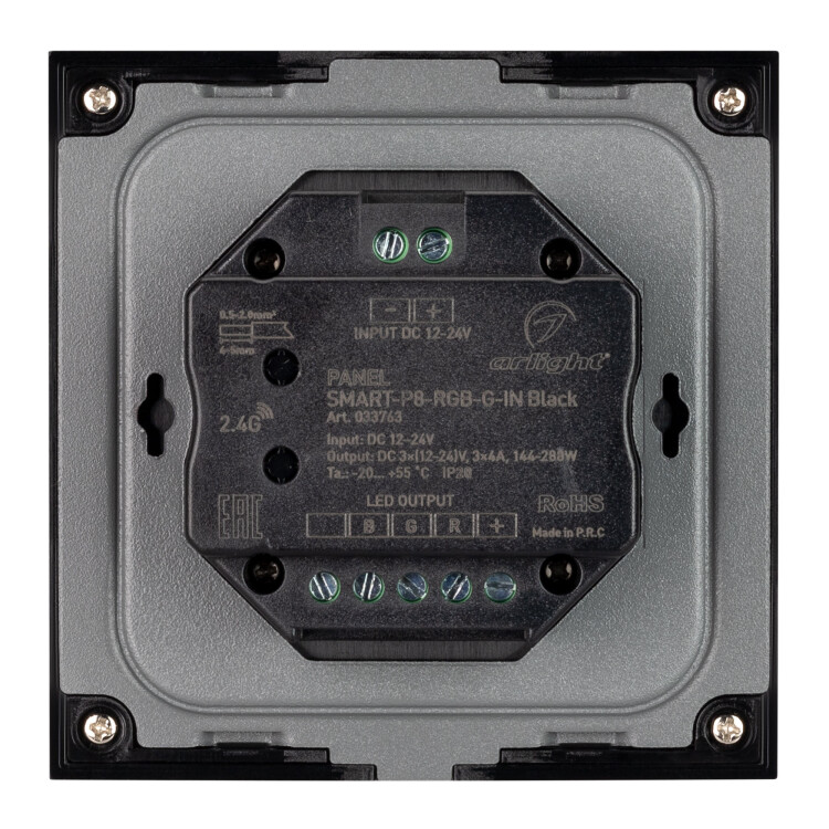 Встраиваемая роторная стеклянная панель 2.4 ГГц, цвет чёрный. Для управления RGB источниками света (ШИМ). Управление цветом с помощью роторного вращателя. Работает в режиме master/slave и может выполнять функцию независимого контроллера. Питание/рабочее напряжение 12-24VDC, 3 канала по 4А максимальной нагрузки на канал, максимальная суммарная мощность 144-288W. Габариты 86х86х50 мм. Панель совместима с контроллерами и пультами серии SMART.