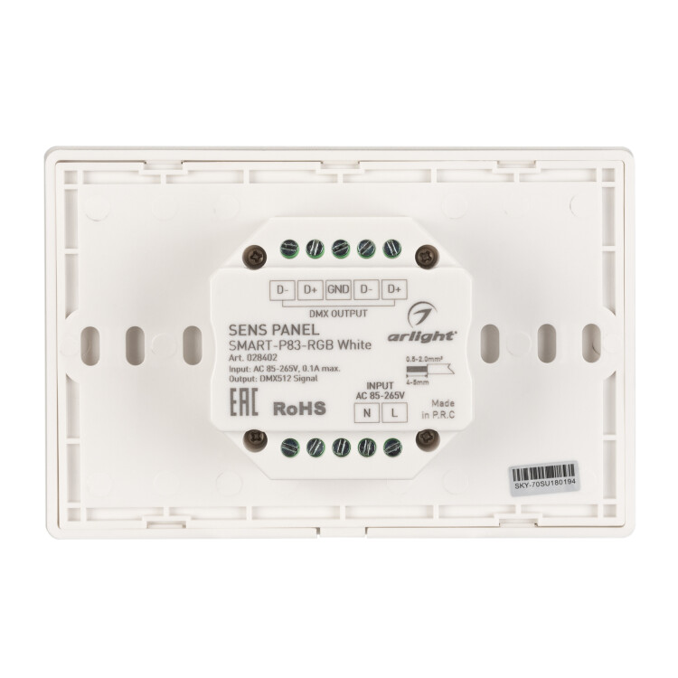 Встраиваемая сенсорная панель 2.4 ГГц, цвет белый. Итальянский стандарт. Материал - стекло. Для управления RGB источниками света (ШИМ), 4 зоны управления. Функция управления DMX512 устройствами. Питание/рабочее напряжение AC 85-265V. Габариты 120х80х37 мм, устанавливается в стандартный подрозетник. Панель совместима с диммерами серии SMART.