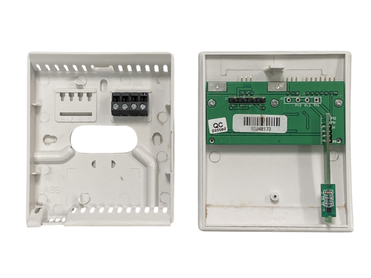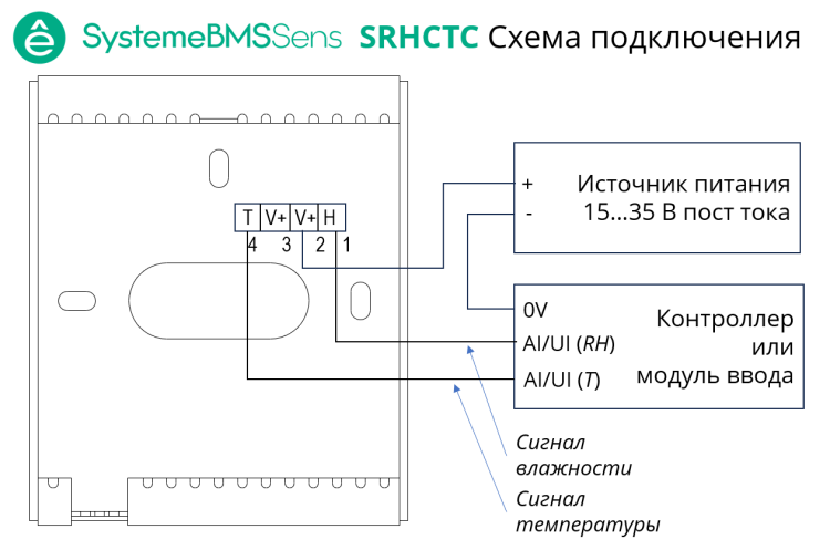 Датчик (преобразователь) влажности и температуры комнатный, для контроля параметров воздуха в помещении, диапазон измерения влажности от 0 до 100 %, выходной сигнал влажности 4…20 мА, диапазон измерения температуры от 0 до +50 °С, выходной сигнал температуры 4…20 мА, напряжение питания 15…35 В постоянного тока, подключение на винтовую клеммную колодку, сечение провода до 1,5 мм², накладная настенная установка или установка на подрозетник с расстоянием 60 мм между крепежными отверстиями, размеры датчика В 100 × Ш 85 × Г 25 мм