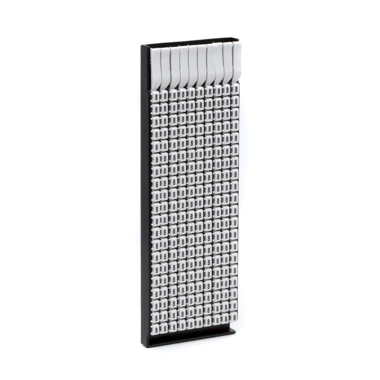 Ручная маркировка системы «Марк» (Mark) 3 для маркировки проводов без разъединения электрической цепи из полиамида 6.6. Температура эксплуатации от –40 до +100 °С. Боковые штифты надёжно фиксируют соединение друг с другом и позволяют добиться точного выравнивания маркеров. Цвет маркеров соответствует международной кодировке. Символ «8» черным цветом на сером маркере для сеч ения провода 4-6 мм2. 160 маркеров в упаковке.