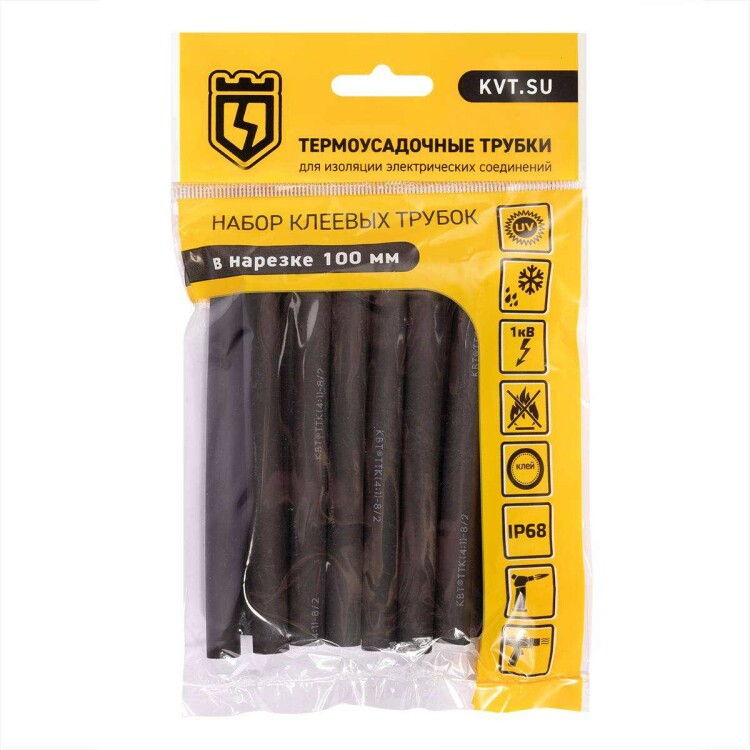 Предназначены для герметизации, изоляции, маркировки и защиты от коррозии контактных соединений. Коэффициент усадки: 4:1. В два раза превышает коэффициент усадки стандартных трубок. Материал: полиолефин, не поддерживает горение. Цвет: черный. По всей внутренней поверхности термоусадочных трубок методом соэкструзии нанесен слой термоплавкого клея. При усадке клеевой подслой расплавляется, заполняет все неровности микрорельефа и обеспечивает полную герметичность соединений. Трубки устойчивы к UV-излучению и погодным условиям. Электрическая прочность изолирующего покрытия зависит от толщины изоляции. При выборе размера термоусадочной трубки следует учитывать то, что чем больше усядет трубка, тем толще будет слой изоляции. Наборы содержат наиболее популярные монтажные размеры и идеально подходят для розничных точек продаж и экспозиции в торговых залах. Инструмент для монтажа: высокотемпературный фен ТТ-1800 или портативные бутановые горелки «КВТ».