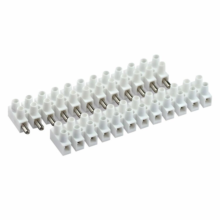 Клеммы (клеммные колодки, клеммные зажимы) используются для подсоединения к электрической части проводников. Они имеют токопроводящую часть, заключенную в диэлектрический корпус. Клеммы разъемного типа предназначены для соединения/размыкая электрических цепей. Номинальное напряжение винтового зажима – 450 В, номинальный ток – 32 А, рабочая температура от –20°C до +85 °C, попер ечное сечение провода – 4 мм², Количество секций - 12. Материал корпуса – полипропилен. Цвет корпуса – белый.
