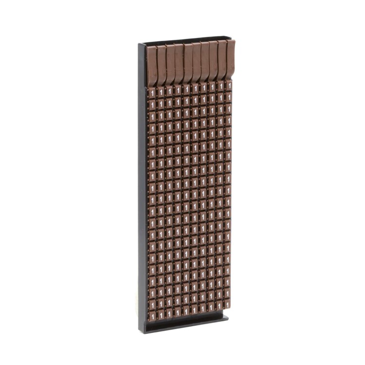 Ручная маркировка системы «Марк» (Mark) 3 для маркировки проводов без разъединения электрической цепи из полиамида 6.6. Температура эксплуатации от –40 до +100 °С. Боковые штифты надёжно фиксируют соединение друг с другом и позволяют добиться точного выравнивания маркеров. Цвет маркеров соответствует международной кодировке. Символ «1» белым цветом на коричневом маркере для сечения провода 1.5-2.5 мм². 200 маркеров в упаковке.