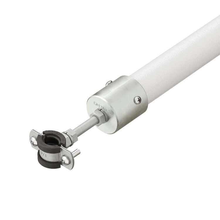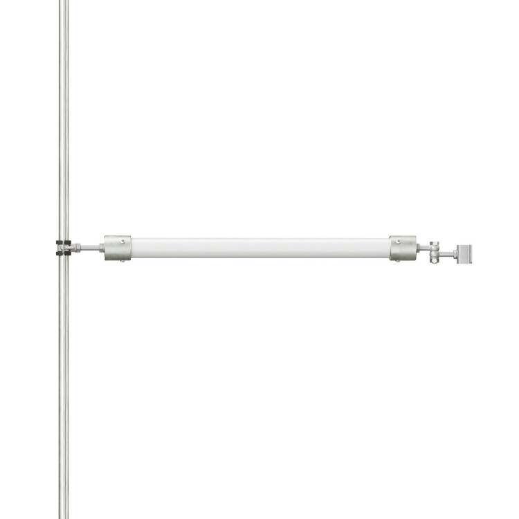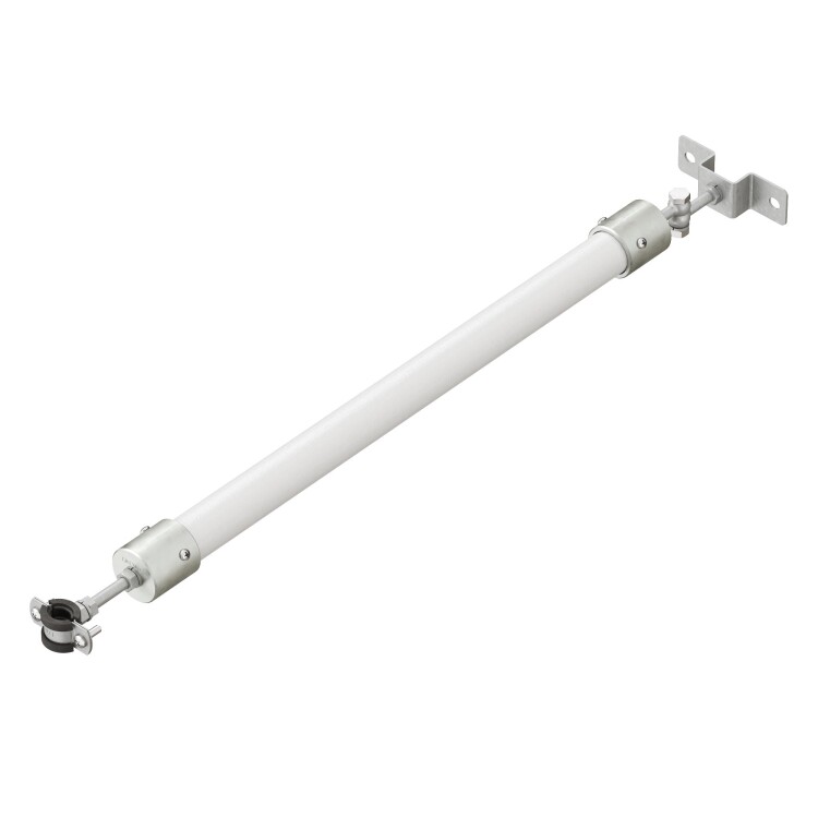 Стабилизатор молниеприемника предназначен для дополнительной фиксации молниеприемного стержня длиной 1-4 метра при установке на бетонном основании на плоской кровле. Стабилизатор монтируется к фасаду здания или стенке оборудования с помощью болтового крепления. Чем выше по длине молниеприемного стержня установлен стабилизатор, тем сильнее фиксация молниеприемника. В качестве основы стабилизатора используется диэлектрическая стеклопластиковая труба. Длина - 1160 мм.