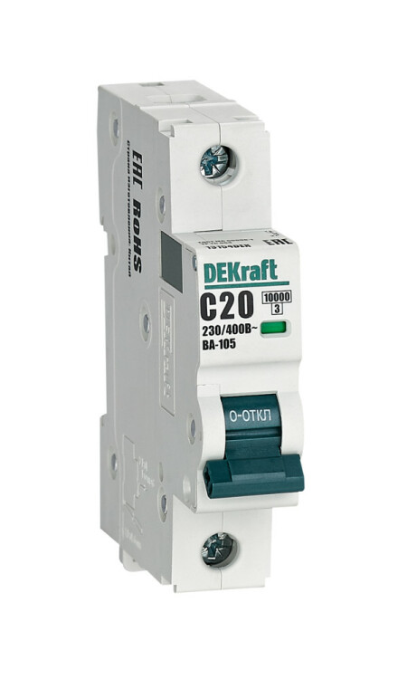 Автоматический выключатель серии ВА-105 DEKraft; 1P; ном. ток 20 А; характеристика C; откл. способность 10 кА; ширина модуля 18мм. Аппараты имеют механизм мгновенной коммутации, 6 монолитных заклепок, которые повышают прочность корпуса. Боковые каналы охлаждения повышают стабильность работы при высоких температурах окружающей среды. Есть возможность установки дополнительных аксессуаров с левой стороны устройства. Аппарат на 100% совместим с корпусами и оболочками DEKraft и Systeme Electric.