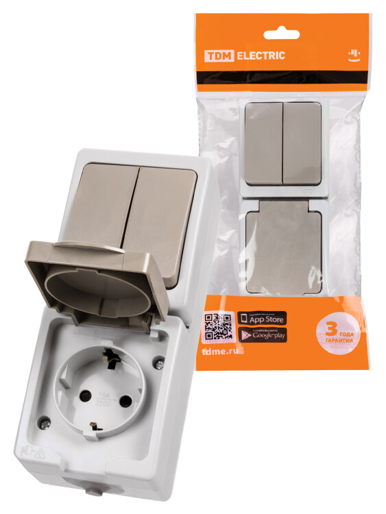 Применение:Бытовые помещения с повышенной влажностью (ванные, санузлы и т.д.).Производственные помещения (мастерские, цеха и т.д.)Наружная установка вне помещений. Материалы:Корпус устройств выполнен из самозатухающего АБС-пластика и обеспечивающего прочность, термостойкость изделий и устойчивость к воздействию солнечных лучей.Контакты розеток выполнены из высокоупругой фосфористой бронзы, обеспечивающей надежный контакт и пожаробезопасность на протяжении всего срока службы изделий.Металлокерамические (AgNi) контакты выключателей, получаемые методом спекания смеси их порошков, позволяют сочетать высокую дугостойкость с хорошей проводимостьюВинты и пружины откидной крышки выполнены из нержавеющей стали.Преимущества:Быстрозажимные клеммы механизма позволяют автоматически регулировать усилие прижима проводника, не позволяя ему просаживаться.Герметичные съемные вводы с двух сторон дают возможность подключения как сверху, так и снизу.Заглубленные пазы для крепления изделия к поверхности обеспечивают класс изоляции II.К каждому изделию в яркой индивидуальной упаковке со стикером, на который нанесена вся необходимая информация о изделии и штрихкод EAN-13, прилагается паспорт с подробной инструкцией по монтажу Назначение:Подключение бытовых нагрузок к сети переменного тока и управление сетями освещения в условиях повышенной влажности и пылезагрязненности. 0: