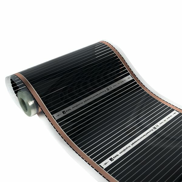 Пленочный теплый пол EKF применяется для сухого монтажа без стяжки не только при капитальном ремонте, но и при косметическом. Толщина пленки -0,338 мм. Обеспечивает быстрый и легкий монтаж. Идеально подходит для укладки под ламинат, паркетную доску, мягкое напольное покрытие: линолеум, ковролин. Инфракрасный пленочный теплый пол состоит из следующих элементов. Полосы углеродного материала шириной около 1,5 см соединены между собой при помощи медных шин с серебряным покрытием, которые и проводят электрический ток. Нагревательный элемент заламинирован с двух сторон плотным полимером, который не задерживает инфракрасное излучение и обеспечивает отличную защиту от попадания влаги, пробоев и возгорания.