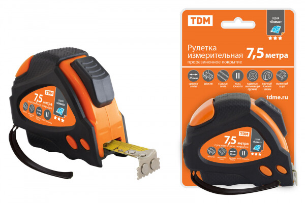 Назначение:br/Для измерения длины предметов, расстояний, проведения разметочных работ.br/Применение:br/В быту: для установки мебели, декоративных элементов и т.д.В строительстве: для укладывания элементов конструкций, разметки и т.д.В промышленности: для установки и монтажа конструкций, прокладки кабеленесущих систем.br/Преимущества:br/Надежная сматывающая пружина и удобный корпус.функция автостоп автоматическая фиксация выдвинутого измерительного полотна (в серии Алмаз)Магниты для зацепления за металлические предметы и дополнительные зубцы в крючке (в серии Рубин).Прорезь в крючке для черчения окружностей (в серии Гранит).Дополнительное усиление заклепок крючка.Удобство и долговечность-прорезиненная вставка способствует хорошему захвату инструмента и надежно защищает корпус рулетки от повреждений при паденииУтолщенное пластиковое покрытие ленты, защищающее разметку.Удобный подвес для размещения в торговом зале, который содержит всю необходимую информацию о преимуществах продукта и типе отвертки, а также штрих-кодbr/Материалы:br/Сматывающий механизм - высококачественная пружинная сталь.ПВХЛента - высококачественная прокатная сталь с полимерным покрытием, защищающим от ржавчины.br/