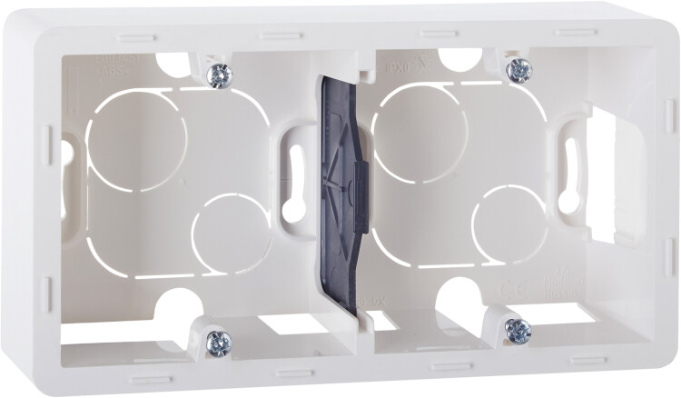 - 2-постовая коробка оборудована гибкой сьемной перегородкой для правильной организации кабеля в коробке и ограничения помех