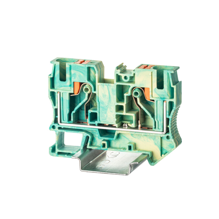 Клемма для заземления с Push-in зажимом предназначена для соединения двух проводников, а за счет кнопки- толкателя обеспечивается защита от ошибок при монтаже и случайного прикосновения. Клемма имеет электрический контакт с DIN-рейкой. Монтаж осуществляется на DIN-рейку OMEGA. Температура эксплуатации от -40 до +105оС. Корпус выполнен из ПА 6.6 с классом горючести V0 UL-94.