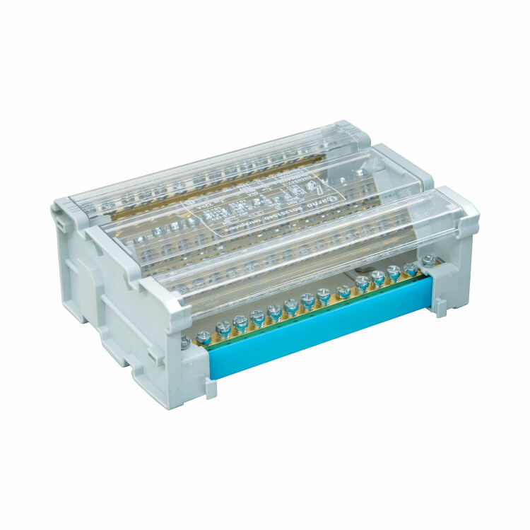 Предназначен для структурированного подключения отводных линий, разведения входящего проводника на несколько потребителей или участков. Позволяет создать упорядоченные системы распределения в электрощитах. Корпус блока выполнен из не поддерживающего горение полиамида PA6.6 и 4-х токоведущих шин в блоках 125 А, представляющие собой бруски из латуни с 15-ю отверстиями, в которые вставляются провода и зажимаются винтом. Избежать случайного прикосновения к токоведущим частям позволяет защитный экран на корпусе блока. Наличие задней крышки для предотвращения контакта с DIN-рейкой или металлической поверхностью сзади.