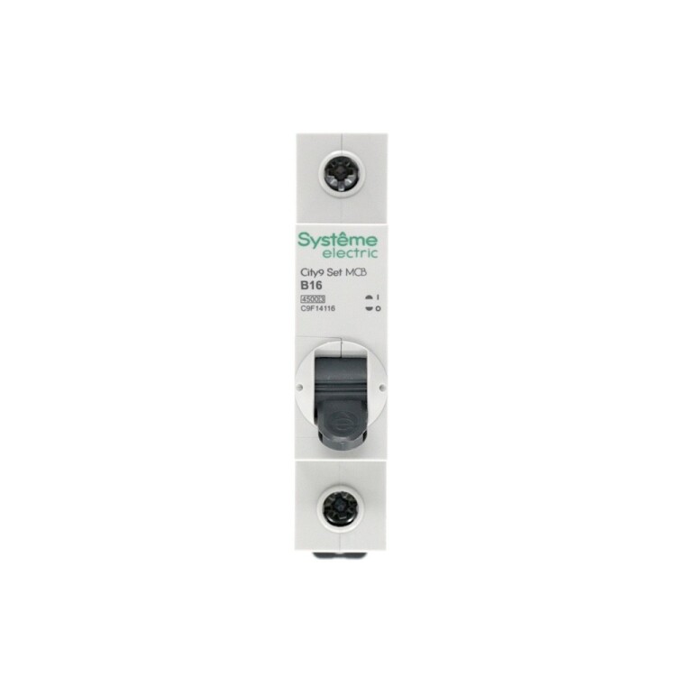Автоматический выключатель серии City9 Set Systeme Electric, 1-полюсный, номинальный ток 16 А, характеристика B, Icn = 4.5 кА. Применяется в электрических сетях напряжением 230 В. Предназначен для защиты от перегрузок и токов короткого замыкания. Оснащен механизмом «мгновенной коммутации». Ударопрочный корпус из специального пластика с 6 металлическими заклепками. Безопасные клеммы исключают попадание кабелей в заклеммное пространство (ранее Schneider Electric Easy9 EZ9F14116).